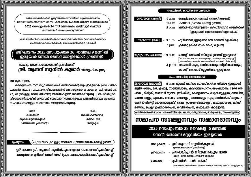 ഇരട്ടയാർ ഗ്രാമ പഞ്ചായത്തിന്റെയും കേരള സംസ്ഥാന യുവജന ക്ഷേമ ബോർഡിന്റെയും സംയുക്താഭിമുഖ്യത്തിൽ കേരളോത്സവം 2025, സെപ്റ്റംബർ 26, 27, 28 തീയതികളിൽ നടക്കും.