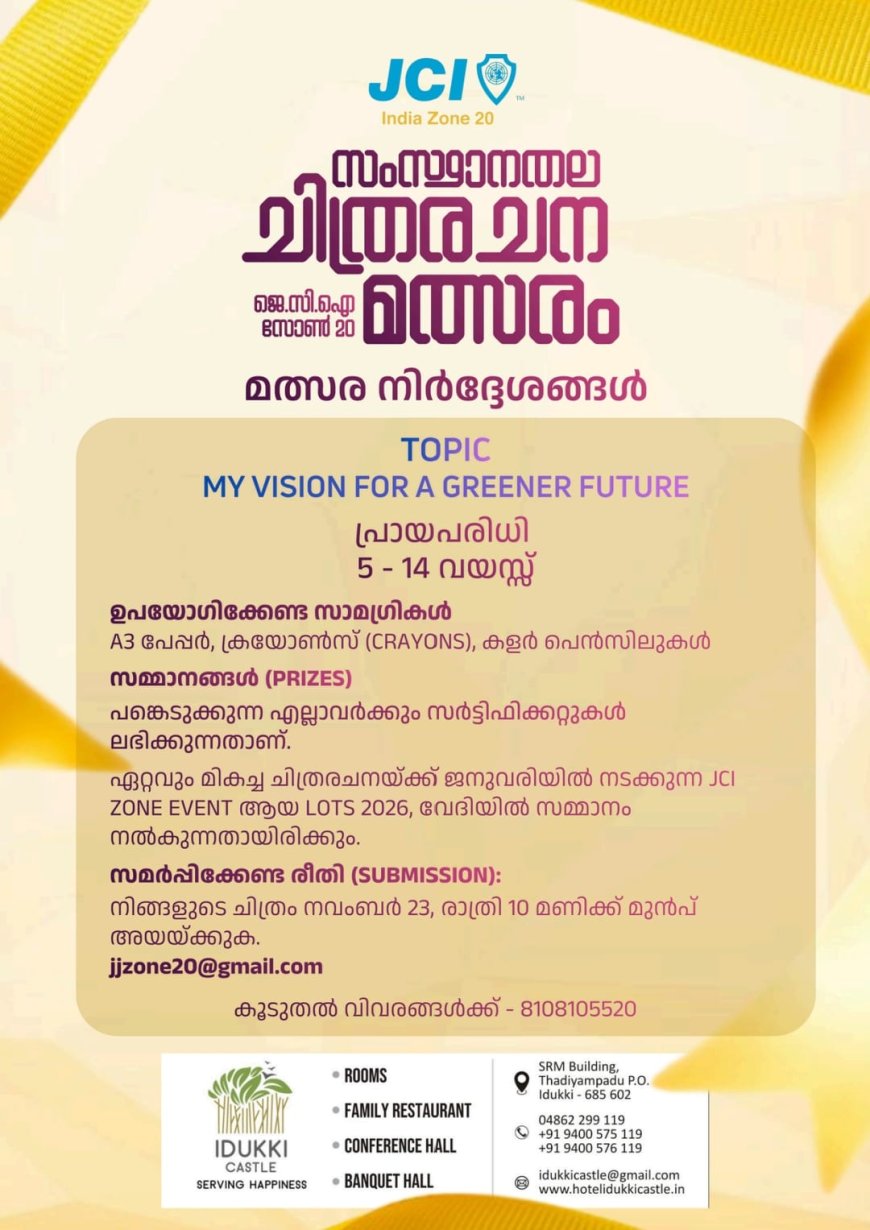 ഇടുക്കി : ജെ.സി.ഐ (JCI) ഇന്ത്യ സോൺ 20, ജൂനിയർ ജേസീസിനായി സംസ്ഥാനതല ചിത്രരചനാ മത്സരം നടത്തുന്നു.