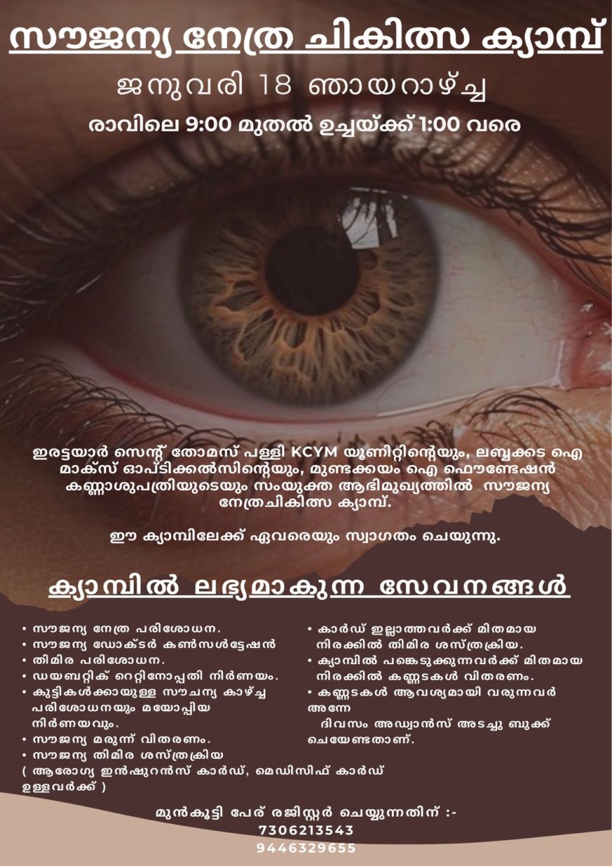 ഇരട്ടയാർ സെന്റ് തോമസ് ഫൊറോനാ പള്ളി KCYM യൂണിറ്റിന്റെയും ലബ്ബക്കട ഐ മാക്സ് ഓപ്ടിക്കൽസിന്റെയും മുണ്ടക്കയം ഐ ഫൗണ്ടേഷൻ കണ്ണാശുപത്രിയുടെയും സംയുക്താഭിമുഖ്യത്തിൽ സൗജന്യ നേത്ര ചികിത്സാ ക്യാമ്പ് സംഘടിപ്പിക്കുന്നു.