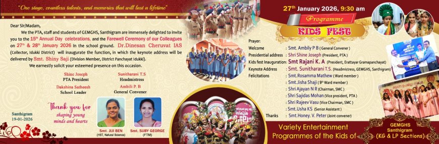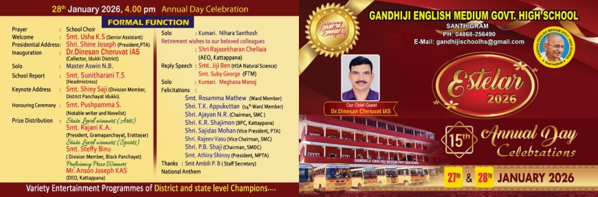 എസ്റ്റെല്ലർ 2026: ശാന്തിഗ്രാം ഗാന്ധിജി ഇംഗ്ലീഷ് മീഡിയം സ്കൂളിൽ പതിനഞ്ചാമത് വാർഷികാഘോഷങ്ങൾ ഇന്നും നാളെയുമായി നടക്കും.