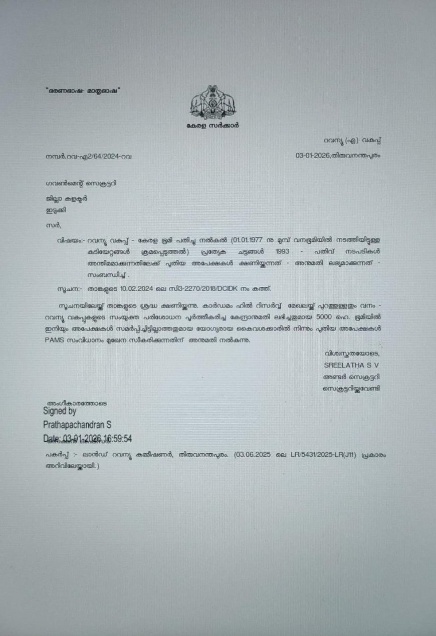 വനഭൂമി കുടിയേറ്റ ക്രമീകരണ നിയമപ്രകാരം പട്ടയം നൽകണമെങ്കിൽ ആദ്യം സിഎച്ച്ആറിലെ പട്ടയ വിതരണത്തിനുള്ള വിലക്ക് നീക്കുകയും, വനം–റവന്യൂ വകുപ്പുകളുടെ സംയുക്ത പരിശോധന പൂർത്തിയാക്കുകയും വേണമെന്ന് ആവശ്യപ്പെട്ട അദ്ദേഹം, അതിന് സർക്കാർ അടിയന്തിരമായി തയ്യാറാകണമെന്നും ആവശ്യപ്പെട്ടു.