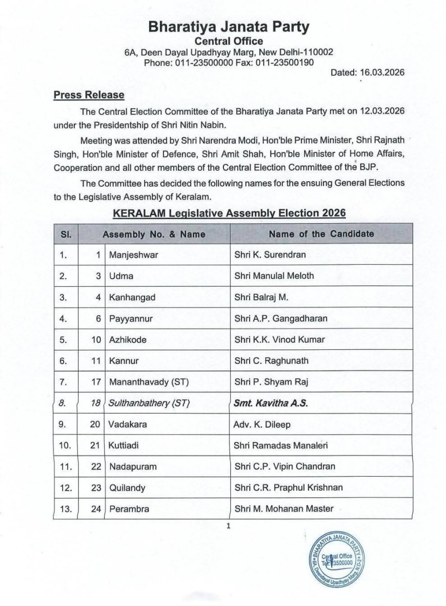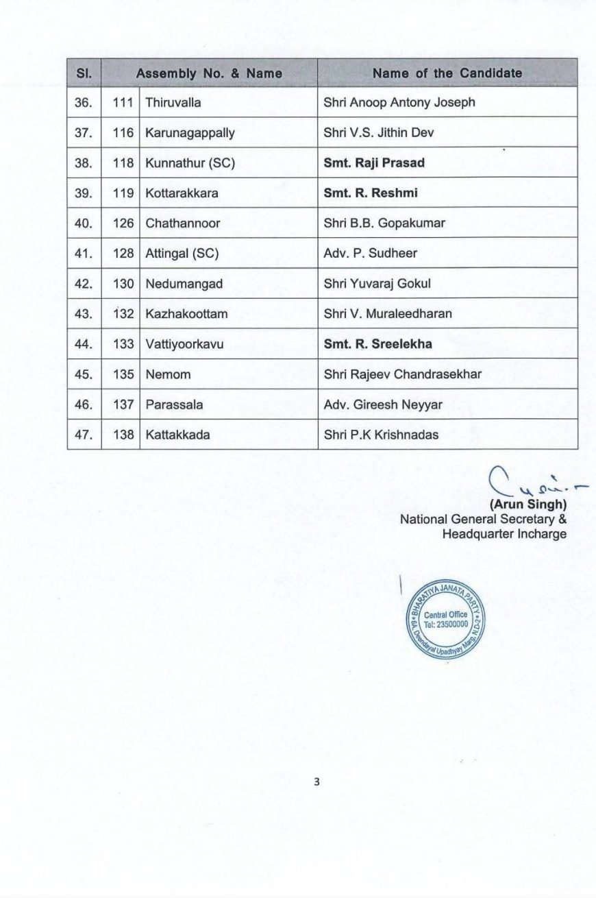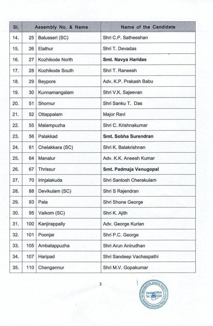 മുൻ ഡി.ജി.പി. ആർ. ശ്രീലേഖ വട്ടിയൂർക്കാവിൽ മത്സരിക്കും. പൂഞ്ഞാറിൽ പി. സി. ജോർജ്, പാലായിൽ ഷോൺ ജോർജ്, തൃശൂരിൽ പത്മജ വേണുഗോപാൽ, ഷൊർണൂരിൽ ശങ്കു ടി. ദാസ് എന്നിവരും ജനവിധി തേടും. കോഴിക്കോട് നോർത്ത് മണ്ഡലത്തിൽ മഹിളാ മോർച്ച സംസ്ഥാന അധ്യക്ഷ നവ്യ ഹരിദാസ് മത്സരിക്കും.