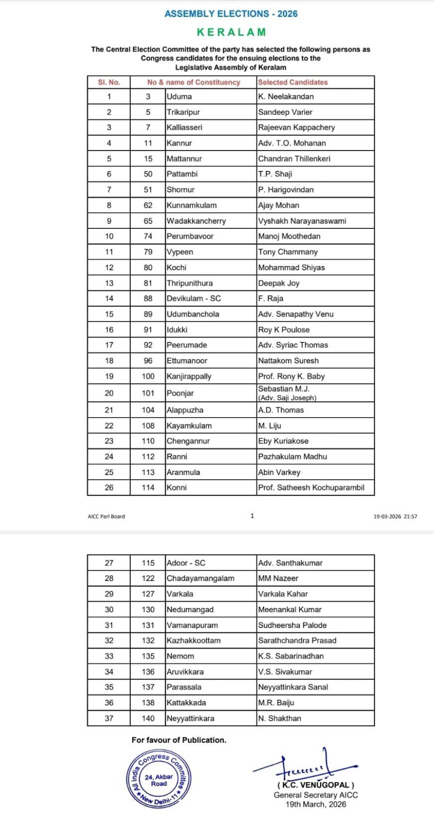 ന്യൂഡൽഹി: നീണ്ടുനിന്ന ചർച്ചകളും വിവാദങ്ങളും അവസാനിപ്പിച്ച് കോൺഗ്രസ് കേരള നിയമസഭാ തിരഞ്ഞെടുപ്പിനായുള്ള രണ്ടാംഘട്ട സ്ഥാനാർത്ഥി പട്ടിക പ്രഖ്യാപിച്ചു. 37 മണ്ഡലങ്ങളിലേക്കുള്ള സ്ഥാനാർത്ഥികളുടെ പേരുകളാണ് എഐസിസി ജനറൽ സെക്രട്ടറി K. C. വേണു ഗോപാൽ പുറത്തുവിട്ടത്.