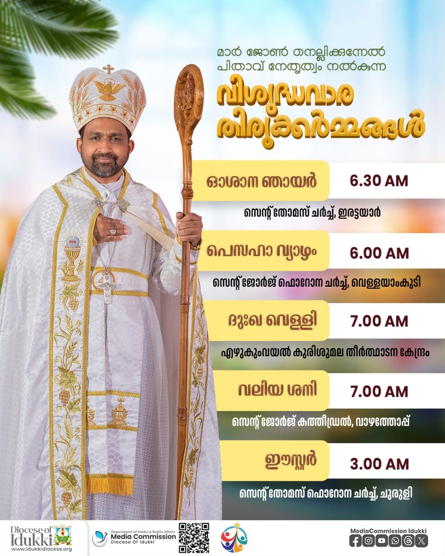ഇടുക്കി രൂപതയുടെ ഓശാന ഞായർ തിരുക്കർമ്മങ്ങൾ ഇരട്ടയാർ സെൻറ് തോമസ് ദേവാലയത്തിൽ ഭക്തിനിർഭരമായി നടക്കും. രൂപതാ മെത്രാൻ മാർ ജോൺ നെല്ലിക്കുന്നേൽ മെത്രാൻ തിരുക്കർമ്മങ്ങൾക്ക് മുഖ്യകാർമികത്വം വഹിക്കും.