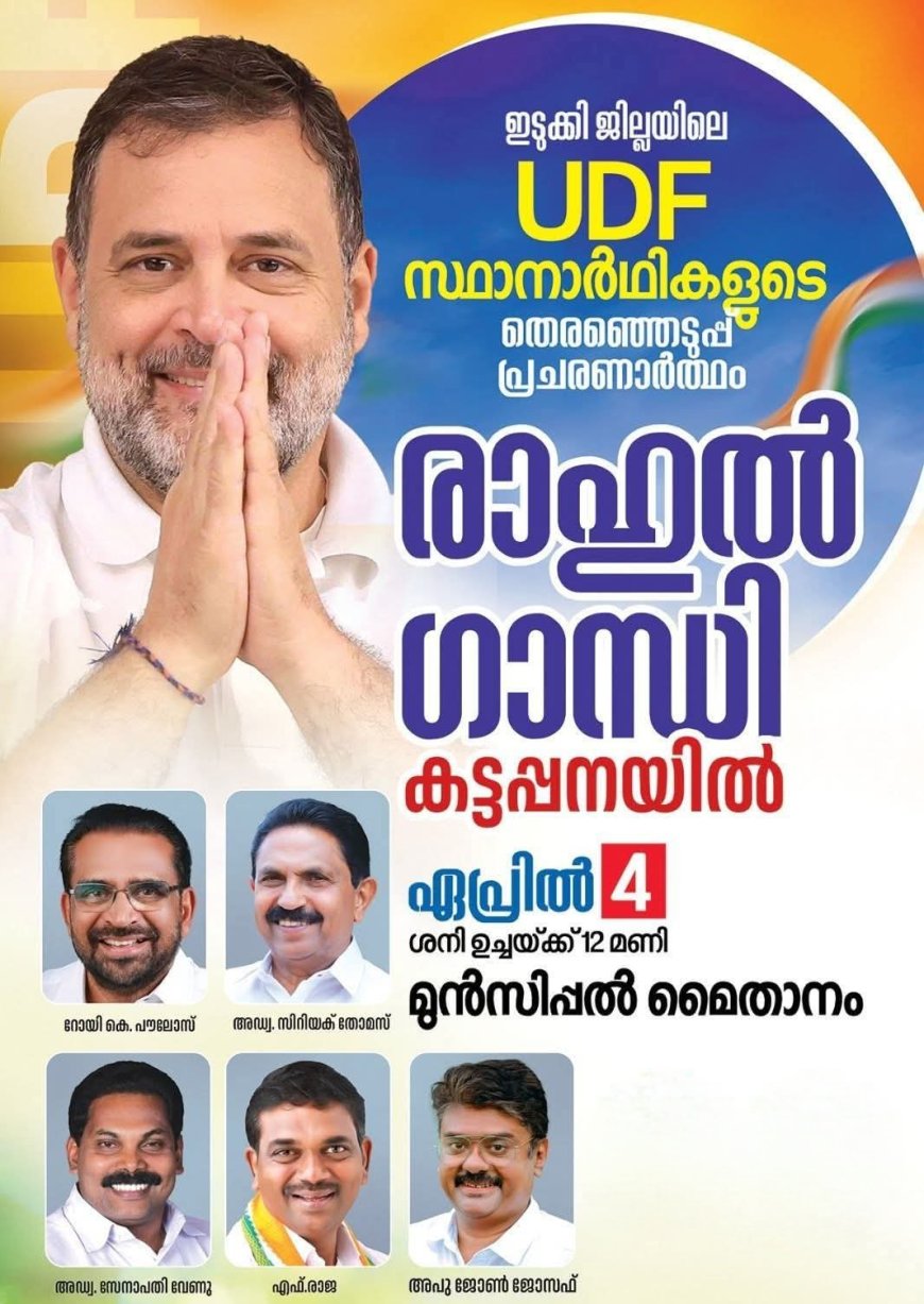ലോക്സഭാ പ്രതിപക്ഷ നേതാവ് രാഹുൽ ഗാന്ധി ഇന്ന്, ഏപ്രില് 4ന് കട്ടപ്പനയിലെത്തും. ഇന്ന് 11 മണിക്ക് ശേഷം ഹെലികോപ്റ്റര് മാര്ഗം സെന്റ് ജോർജ് സ്കൂൾ ഗ്രൗണ്ടിലെത്തുന്ന അദ്ദേഹം, 12.30ന് നഗരസഭാ മൈതാനിയില് നടക്കുന്ന പൊതുസമ്മേളനം ഉദ്ഘാടനം ചെയ്യും.